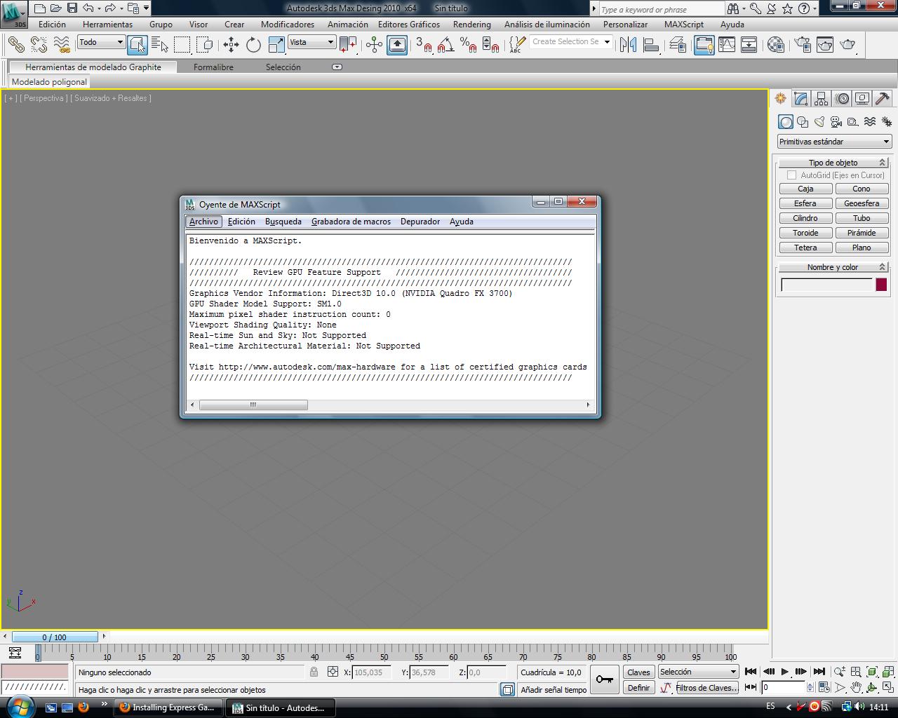 Hola de nuevo a todos/as. Ya configuré he instalé en mí nueva Workstation con el sistema operativo Windows Vista 64 service pack 2 y 3ds Max design 2010 64, recuerdo que tuve muchas dudas sobre la tarjeta gráfica y al final me decidí por una Quadro FX 3700, la cual esta actualizada al último driver 186.30 recién salido.