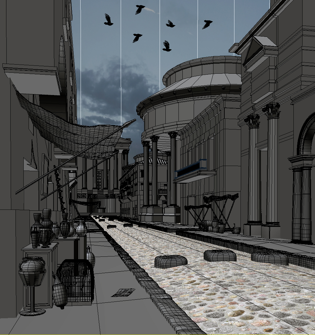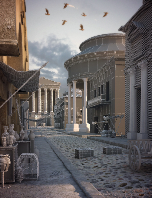 También tienen alcantarillado. Y había muchas fuentes publicas, y en las aceras en tu render no hay obstáculos, para evitar el desgaste de las ruedas con las empedradas e irregulares calzadas, ponían una rueda fuera de la calzada, en la hierba, o campo, para así gastar más solo una rueda, y para evitarlo las autoridades romanas a una distancia a los lados ponían pilotes de piedra, como si fueran los antivadenes de ahora para que no aparquen los coches.