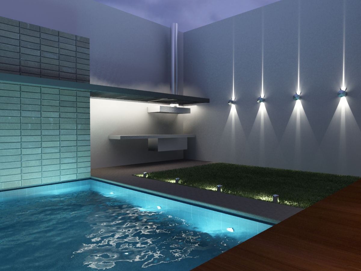 No están nada mal los renders, te quedo muy currada la piscina, pero la textura de los ladridllos creo que te quedo muy grande y muy plana, en el interior, yo daría un material tipo cristal a los focos del techo, porque parece que tienen una tapa.