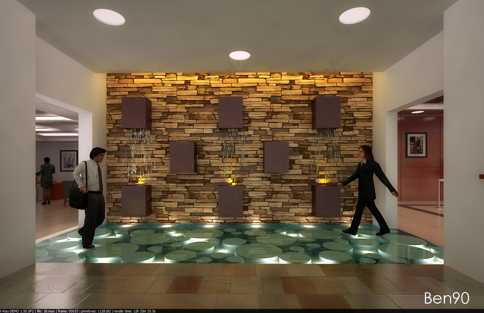 El suelo translúcido, me encanta como te ha quedado, no pillo de las gotas, no puede ser agua porque si lo fuera estaría cayendo fuera de los cubos y las gotas deberían ser más pequeñas, la textura de la pared del fondo es demasiado grande, yo la disminuiría y le daría un poco más de claridad, el juego de luces blancas y amarillas no me mola, en mi opinión o blanco o amarillo, porque el resto de la estancia es muy blanca y la textura de los mosaicos también me queda muy grande al ojo, yo la escalaría más pequeña.