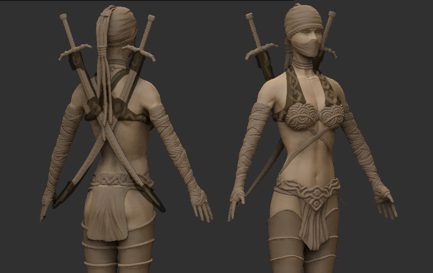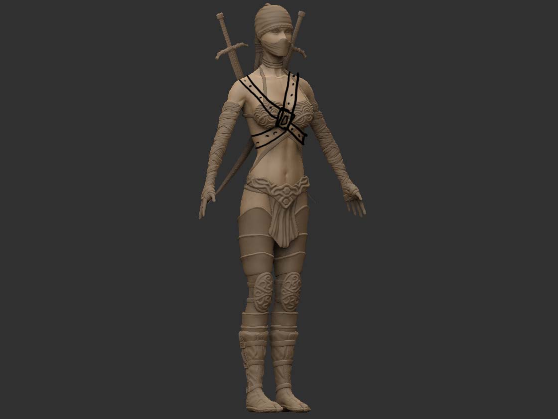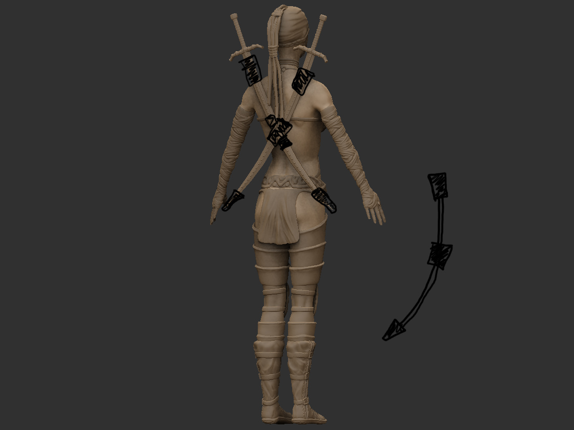 Ahora que la miro mejor, le veo una pega muy grande: le falta unas tetas de esas de la verdad. Coñas aparte, he estado mirando, y quizás te sirva para algo este concepto de vaina para las espadas. Es la parte de cuero que está a la derecha de la espalda. Ya me dirás que te parece: