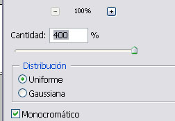 En la nueva capa le aplicamos un filtro/ruido/añadir ruido con los valores siguientes: