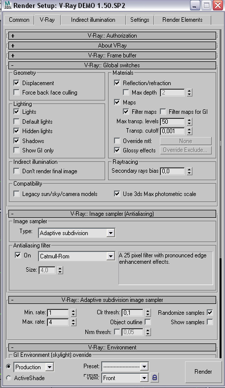 Hola villero, yo cambiaría el rebote secundario y lo pondría en Quasi Montecarlo, aparte si le das más caña al Irradiance Map conseguirás también buenos resultados, por lo demás yo lo veo todo bien a mi parecer, seguro que se le puede dar muchas vueltas de tuerca más, pero si el resultado te convence, sigue por ese camino.