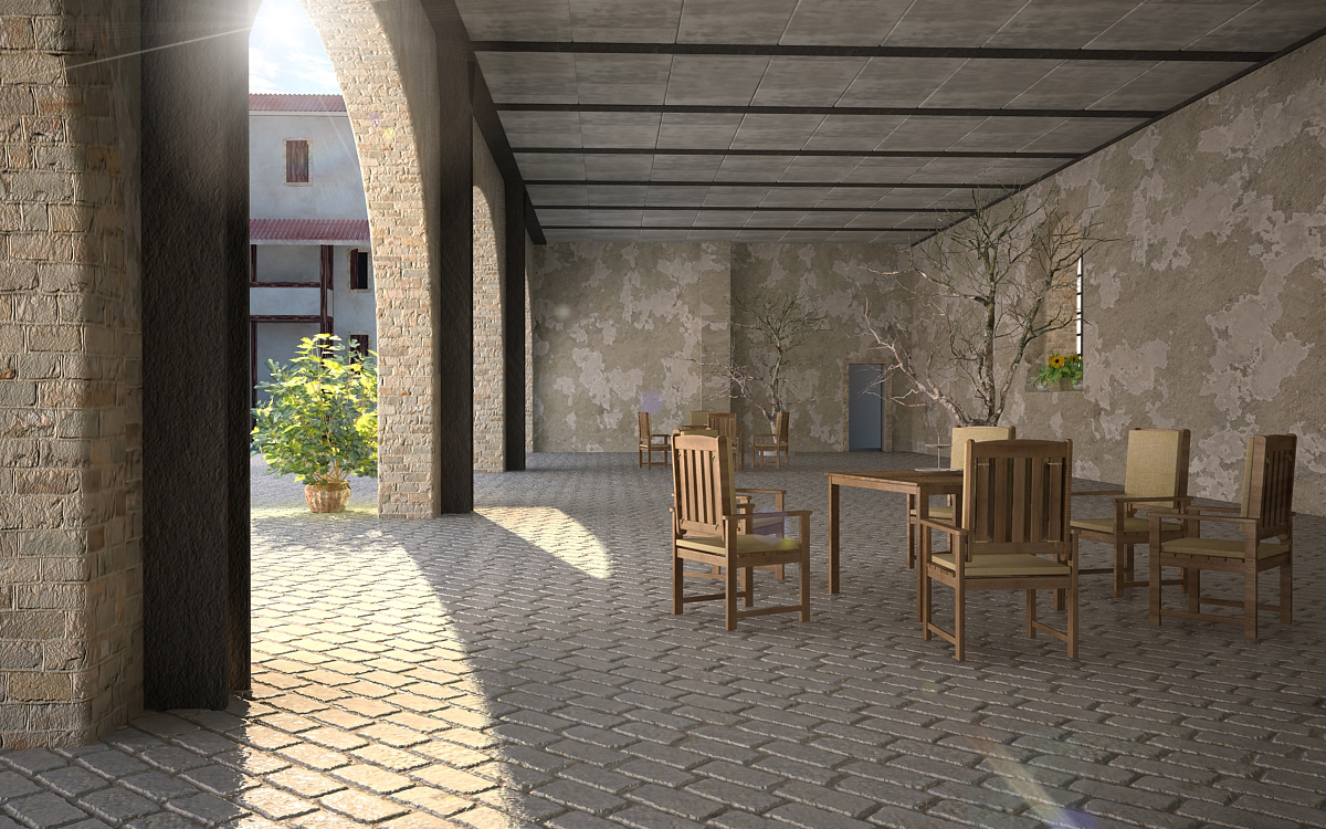 Pues es muy bonito en cuanto a materiales, luz y composición, me gusta el brillo del sol que se ve por esa esquina, pero cuidado con las sombras, dentro del porche parece que las sillas floten, les falta una sombra más definida, y la resolución de la sombra donde el sol entra en el porche también tiene problemas.