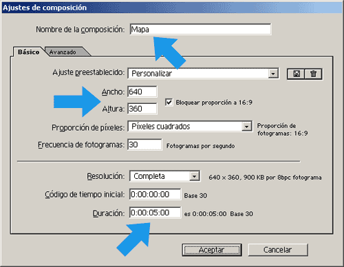 2. Crea otra composición de 5 segundos de duración. Asegúrate que tenga el mismo tamaño de tu bandera. Llama a esta composición ¨mapa.