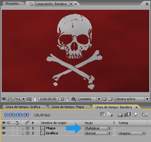 7. Importa ¨gráfica¨ y ¨mapa¨ a una nueva composición. Ubica ¨mapa¨ en la capa superior (#1) y modifica su modo de fusión a multiplicar. Menú capa/ modo de fusión/ multiplicar.