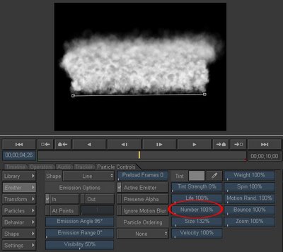 5. Si te adelantas un poco en la línea de tiempo puedes ver cómo el humo que acabamos de crear se torna muy espeso y luce muy clonado, con segmentos repetidos. Una opción es modificar el porcentaje de partículas desde la pestaña Emiter, pero en general los controles de esta pestaña son muy limitados y no modifican el comportamiento de las partículas.