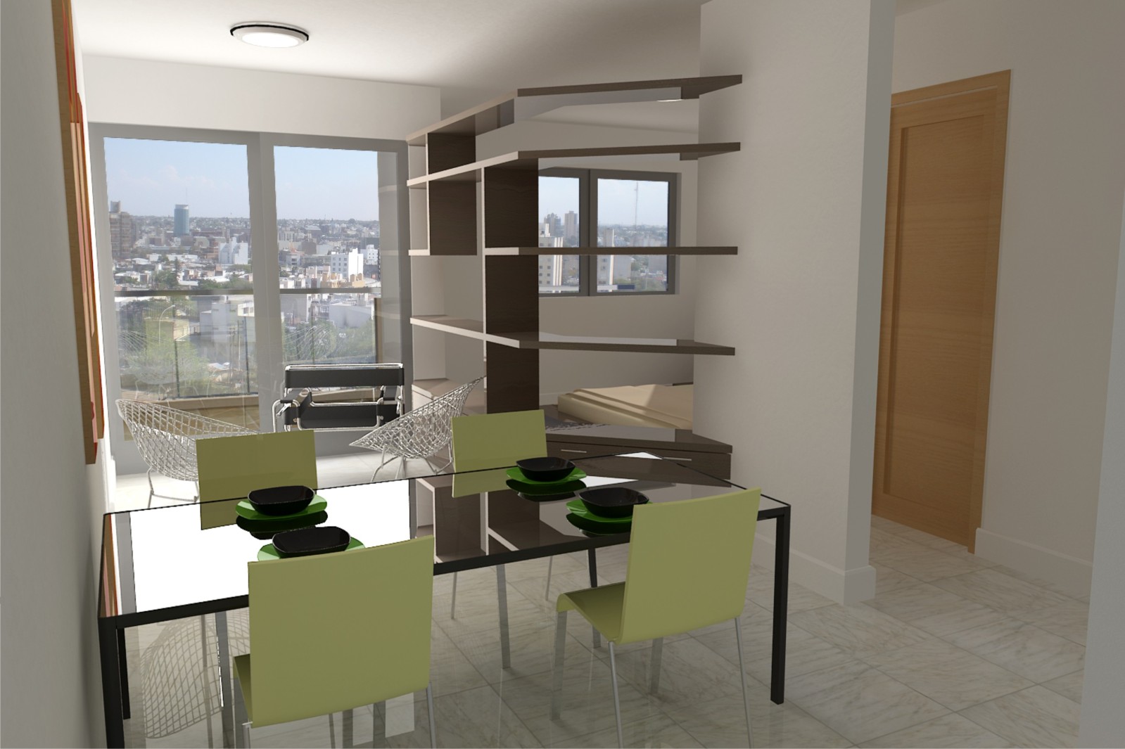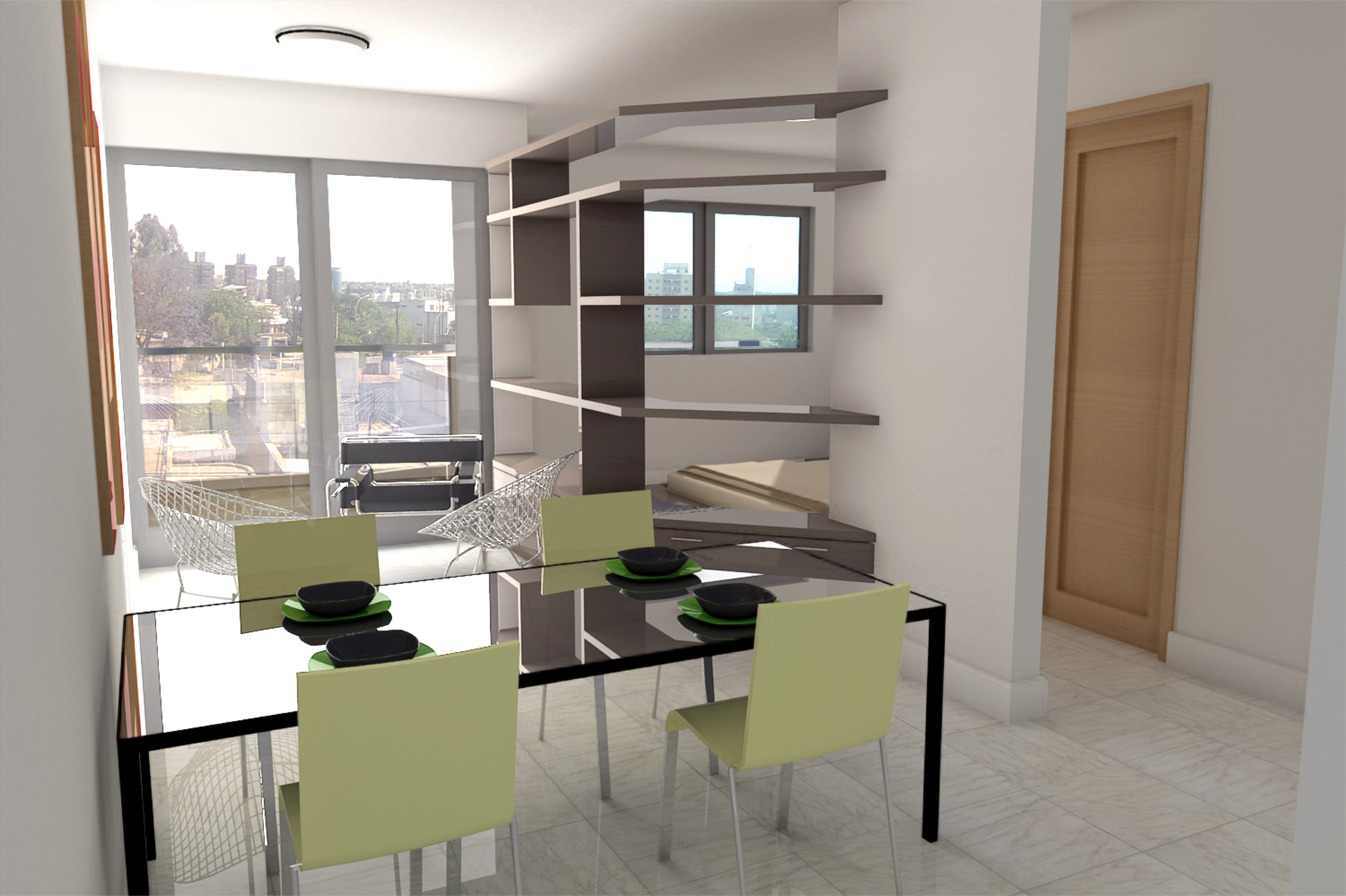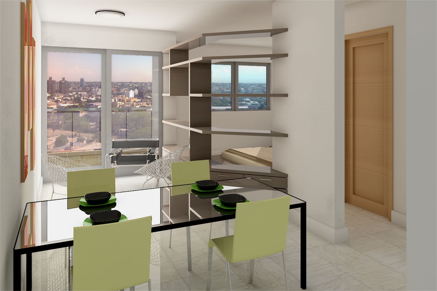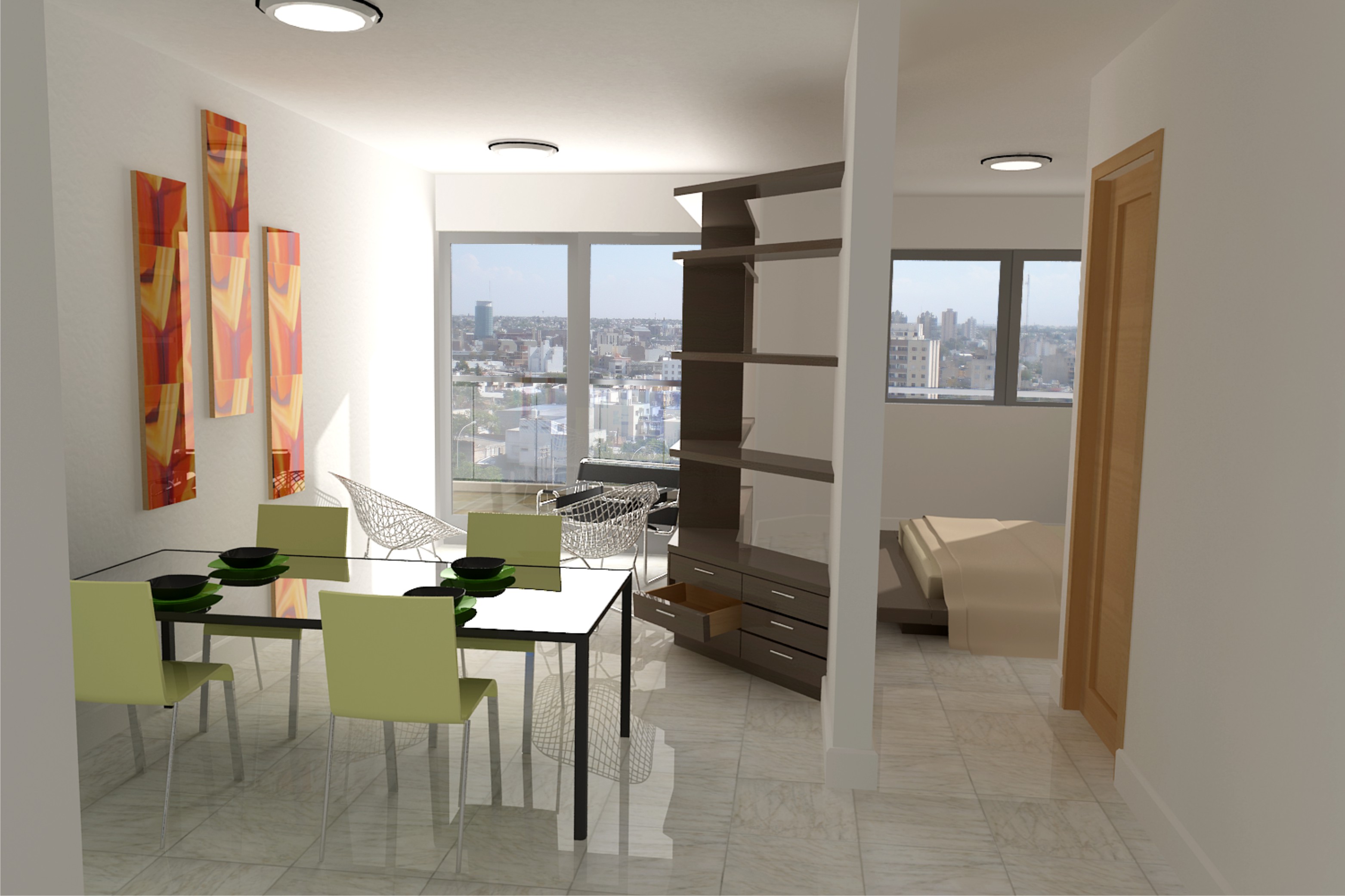 Hola, lo que muestro son 2 renders interiores de un monoambiente, esta ubicado en el 4º piso de un edificio de 7 plantas, es muy chico el espacio así que, hay que hacer malabares para que parezca más agradable que una pajarera.