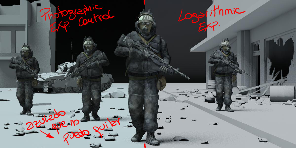 Adjunto lo que tengo testeado. Es un boceto bastante chapucero, pero me sirve para probar la cámara, luz y demás cosas antes de ponerme a modelar todo el entorno. Evidentemente lo que hay ahora es de prueba, igual que los muñecos clonados.