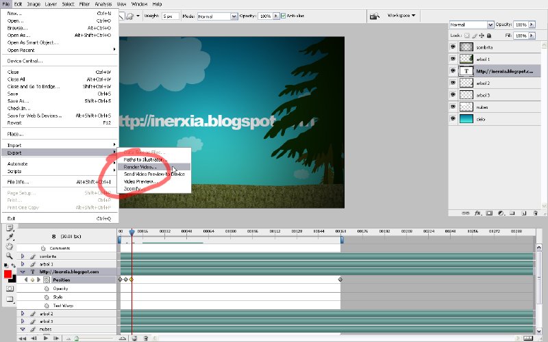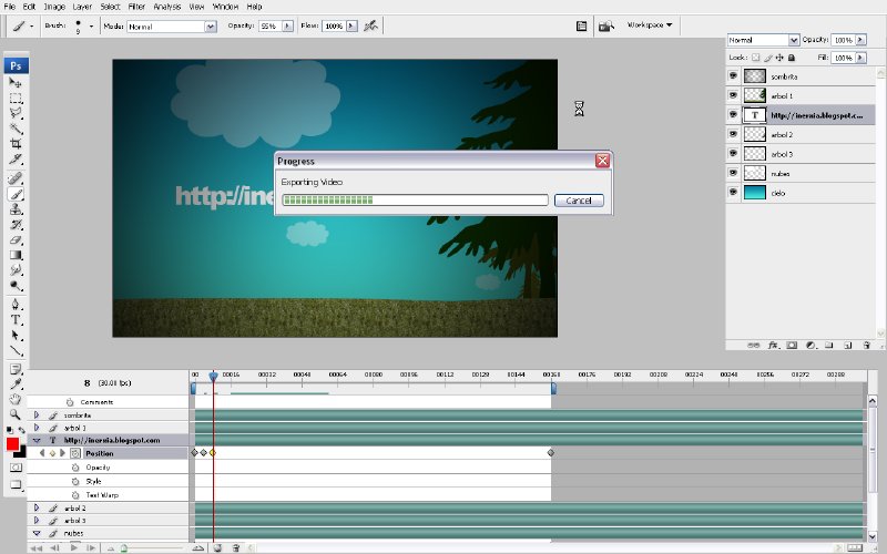 7. En esta nueva versión de Photoshop se puede exportar la animación directamente en formato quick time, en la versión anterior (cs2) había que hacerlo desde imegeready, el problema es que debemos tener la versión CS3 extended e instalado quick time 7.1.