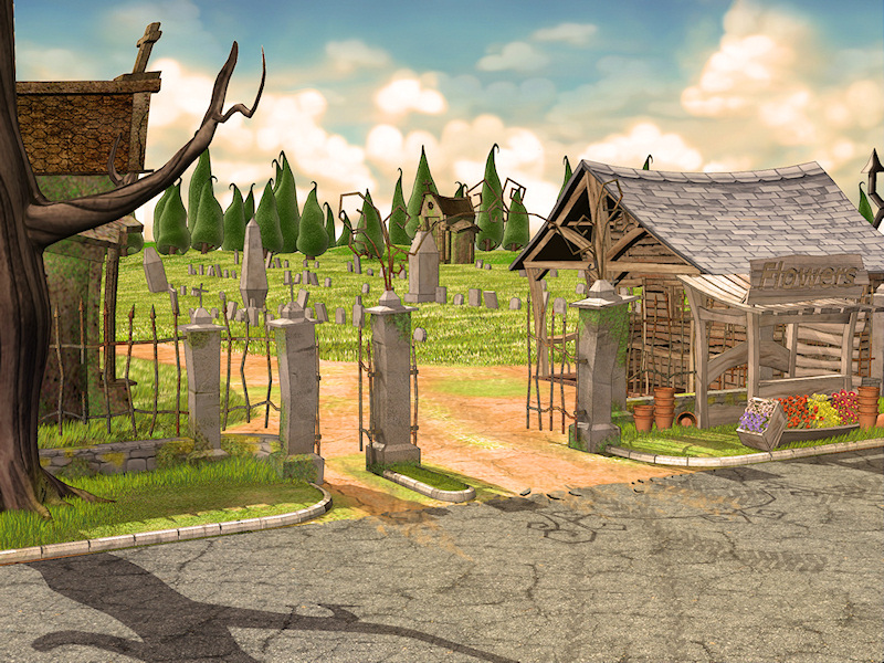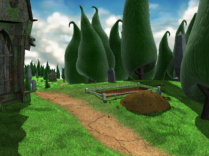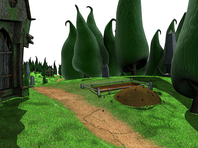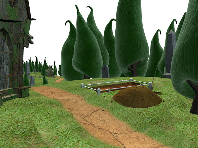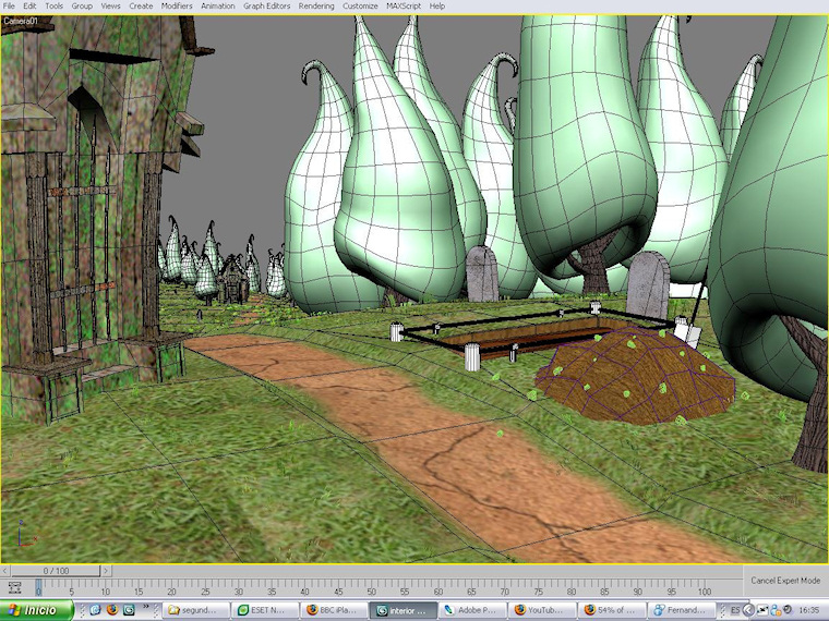 The next step is draw the effects and objetcs that arent maked with the 3d modeler, y, e.: the Ground around the Tomb, the detail of the tres, the Grass, etc. This is the image (incompleete, it necessary apply more effects, but it ok for the tutorial purposes):