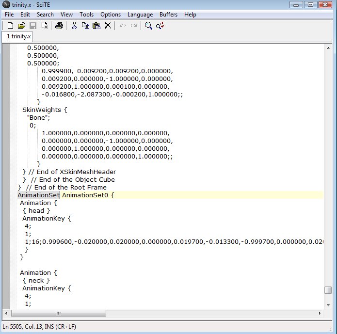 Now in scite, y click on search and search for the Word animationset. There Will only be one animation exported from the exporter and it the last bracket in the x file.