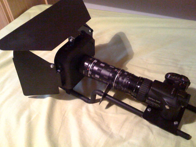 Y ya tenemos el matte box, lo unimos al resto del equipo. La cámara también es una modificación mía para obtener un look de 35 milímetros a través de una serie de lentes y anillos conversores: