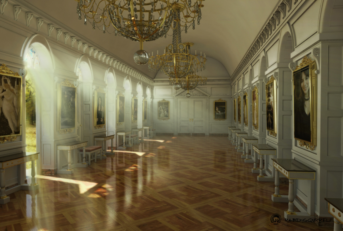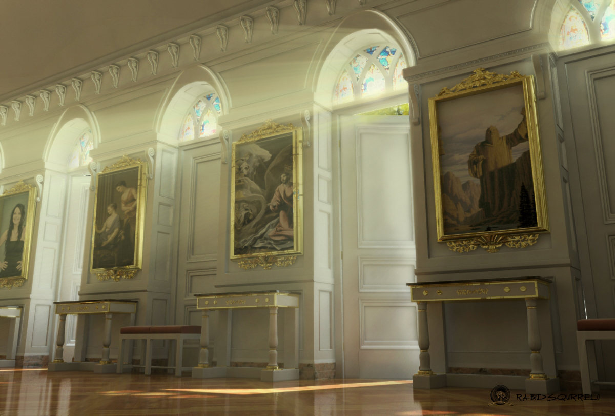 Este trabajo tomó un poco menos de 2 semanas, modelado en 3dsmax 2009, renderizado con Mental Ray y unos retoques en Adobe Photoshop. Algunos quizás reconozcan algunas imágenes conocidas entre las pinturas, que tienen cameos especiales de anette olzon, nightwish, los argonath y minas Tirith. También esta mi novia en una de las pinturas. Espero sus comentarios y ojalá les guste.