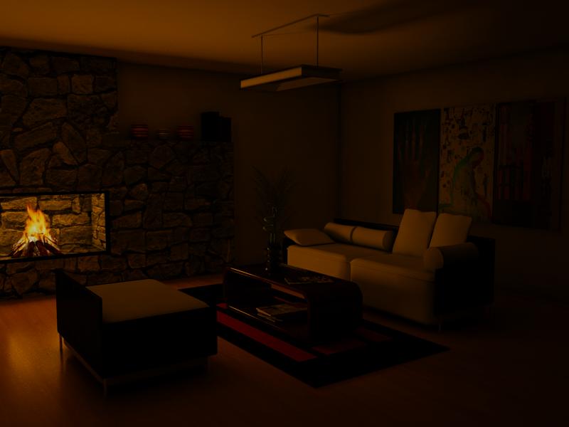 Me gusta más la 1era imagen, aunque la chimenea parece plana, no se muestra bien la profundidad, en la segunda imagen la iluminación de los cuadros sale de la nada? Ese haz son de dicroicos? La última imagen tiene su encanto se ve bien.