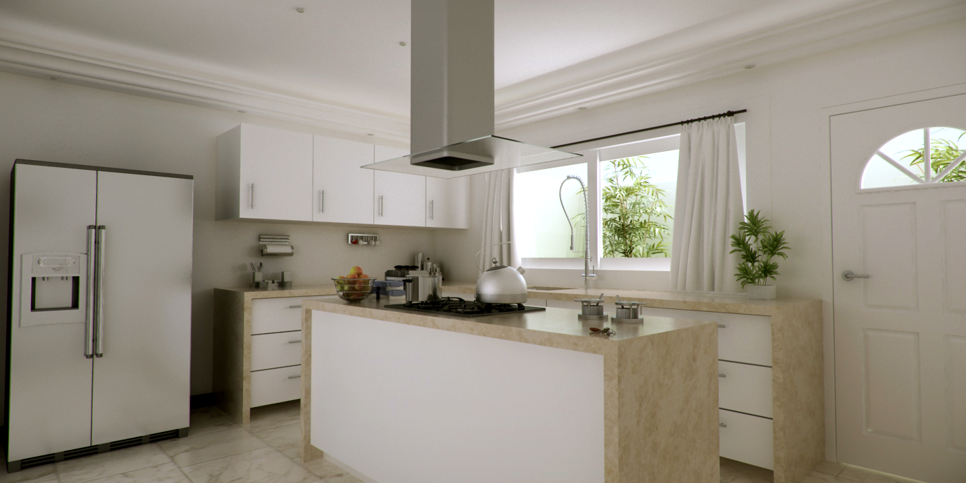 Muy buen rendering felicidades, me gustó el de la cocina más que el del pasillo, con respecto a esto mismo, para que se vea más realista todavía le pondría zócalo a los muebles de las paredes parece que están como flotando en el aire, el extractor además no es un ducto solamente sino que tienen como una especie de parrilla por dónde se filtran las grasas, los muebles aéreos le cambiaría el abatimiento para que abran dos para la izquierda y dos para la derecha que es por lo general lo que se hace, a manera de composición nada más, el refri es el que no me convence mucho, pero están muy bien el rendering y el mensaje. Saludos.