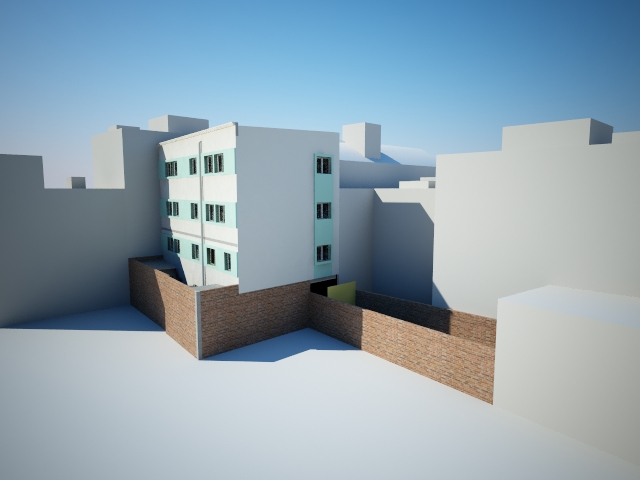 Buenas tardes a todos. Estoy con una escena exterior en la cual he modelado un edificio (el cual necesito mostrar) y los edificios colindantes a modo de box con texturas planas para que pierdan importancia.