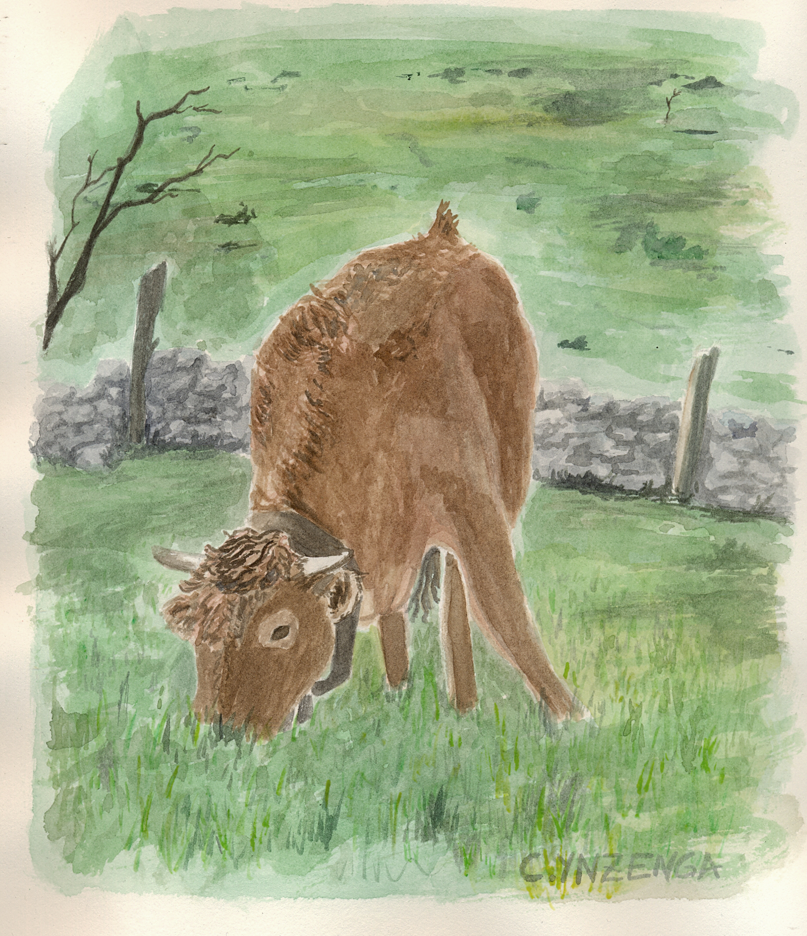 Para la acuarela de la vaca usé esta fotografía del máquina de Acortes, que menudas fotografías que saca. Ahora después de terminarla, veo algunos fallos en las proporciones de la vaca y que apenas tiene sombras. A ver si para las próximas me arriesgo un poco más.
