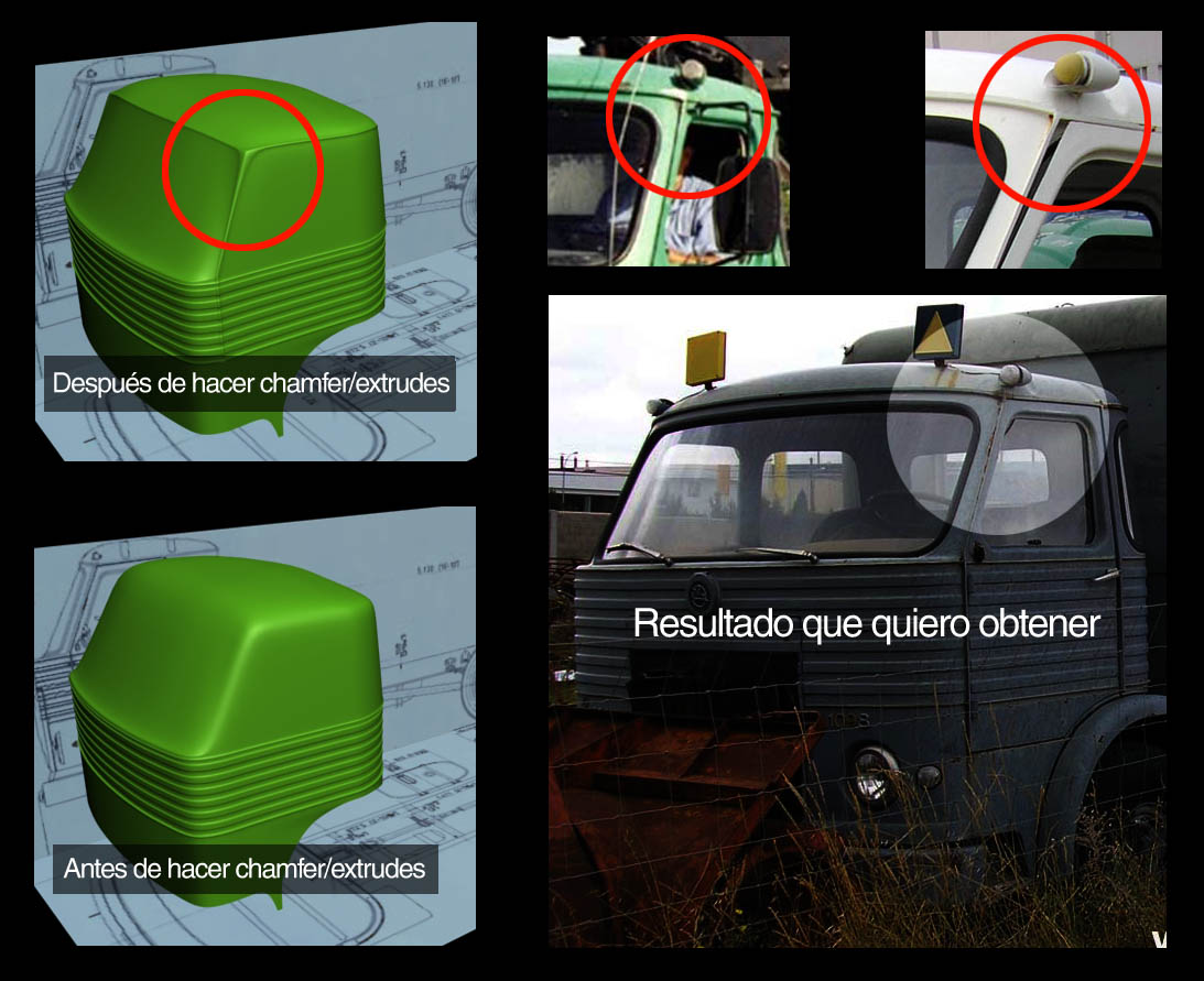 Pues bien, los nervios de la parte baja de la cabina y las de la parte baja del parabrisas, sin problemas. El marrón viene con los nervios de la parte superior. Se juntan los de la puerta y los del techo y no hay forma de que los 3 nervios confluyan de manera angulosa y limpia al aplicar el Smooth de turno (he probado MeshSmooth y TurboSmooth y el resultado es el mismo). En la confluencia entre las tres aristas -si lo hago extruyendo aristas- O la confluencia entre los 3 mini-Chamfers, no queda una unión limpia, sino que queda como hinchada.