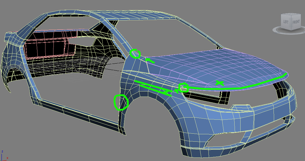 También te digo, que hasta dónde se de modelar coches, no tengo mucha idea, que es un error separar los distintos elementos de la carrocería todavía, pues igual podrías necesitar sacar loops de una zona a otra, y verte comprometido. Saludos.