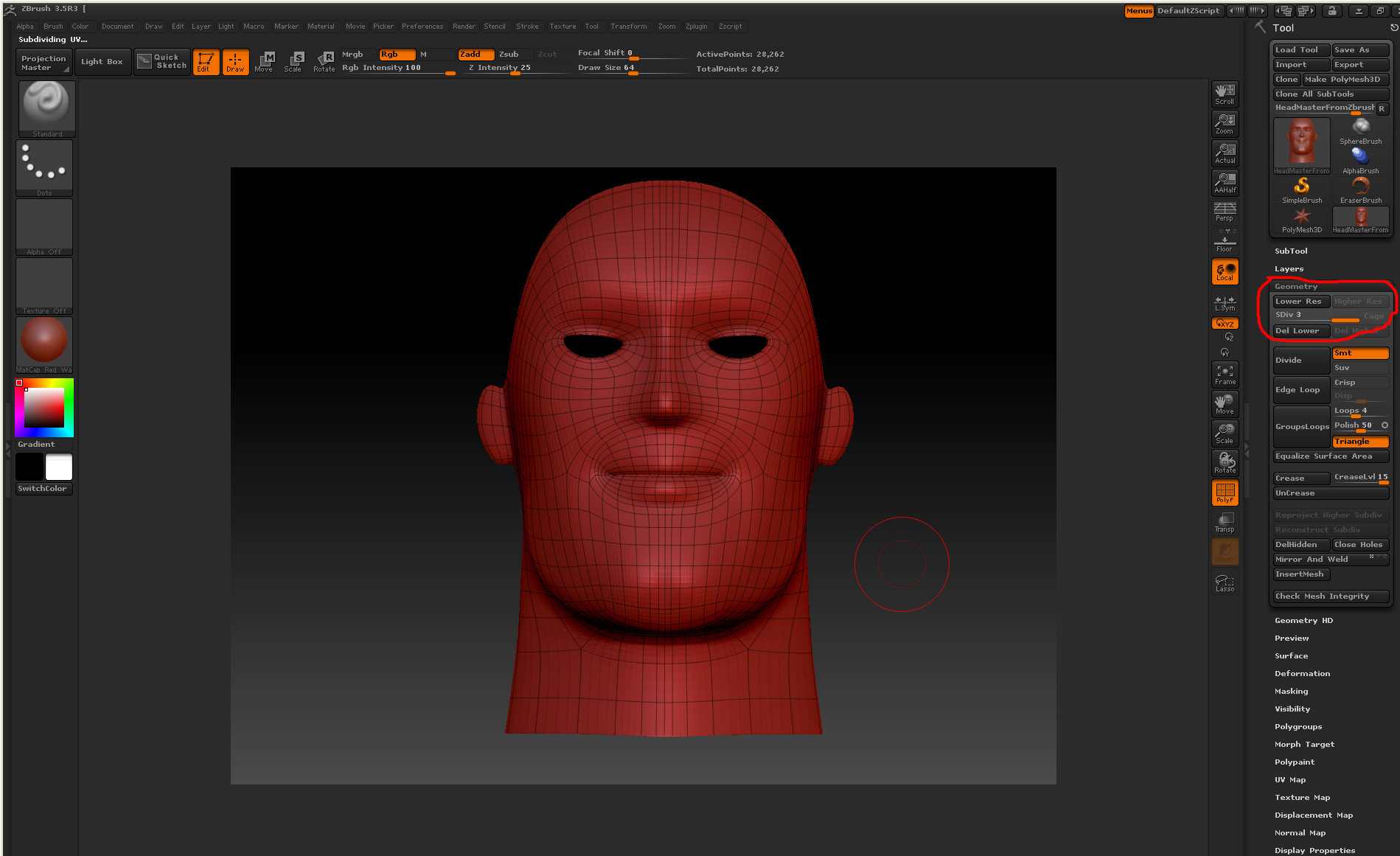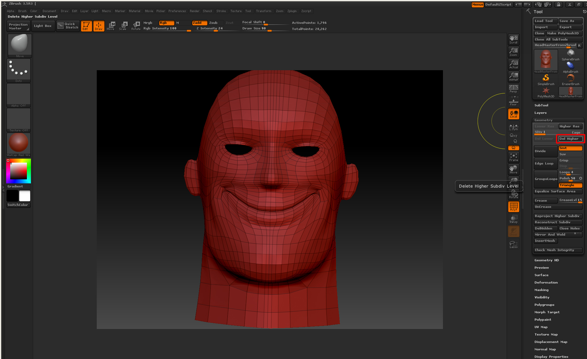 En el ZBrush nuevamente importe el (*.obj), lo subdividi y baje las subdivisiones, y automáticamente al aplicarle subdivisiones cambia la geometría, sin importar borrar las subdivisiones.
