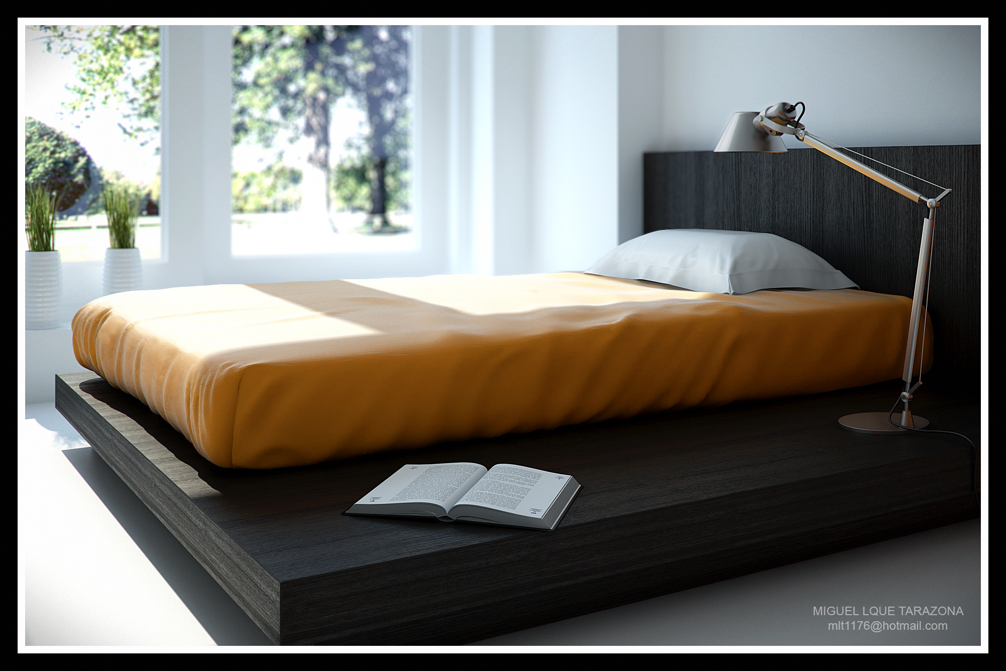 Hola según sus sugeriencias, he tratado de corregir algunas cosas: Texturas, intensidad de luz, el colchón, las circunferencias geométricas de la alfombra entre otros detalles.
