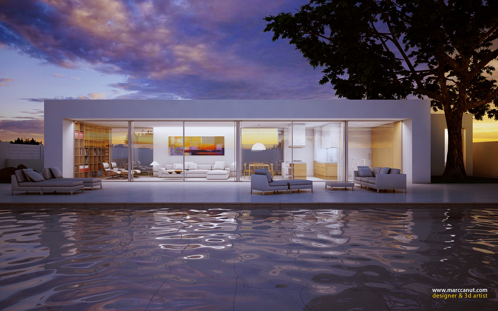 La casa de mis sueños. De solo una planta, abierta al paisaje y de líneas minimalistas. Realizado en 3ds Max, Vray y corrección de color en After Effects.