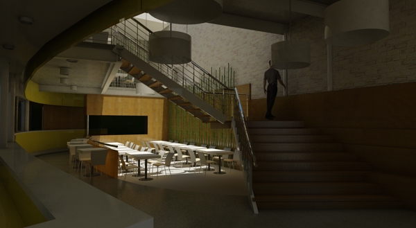La imagen es un proyecto de un restaurante, en una vieja casona y que tiene un patio interior para iluminar.