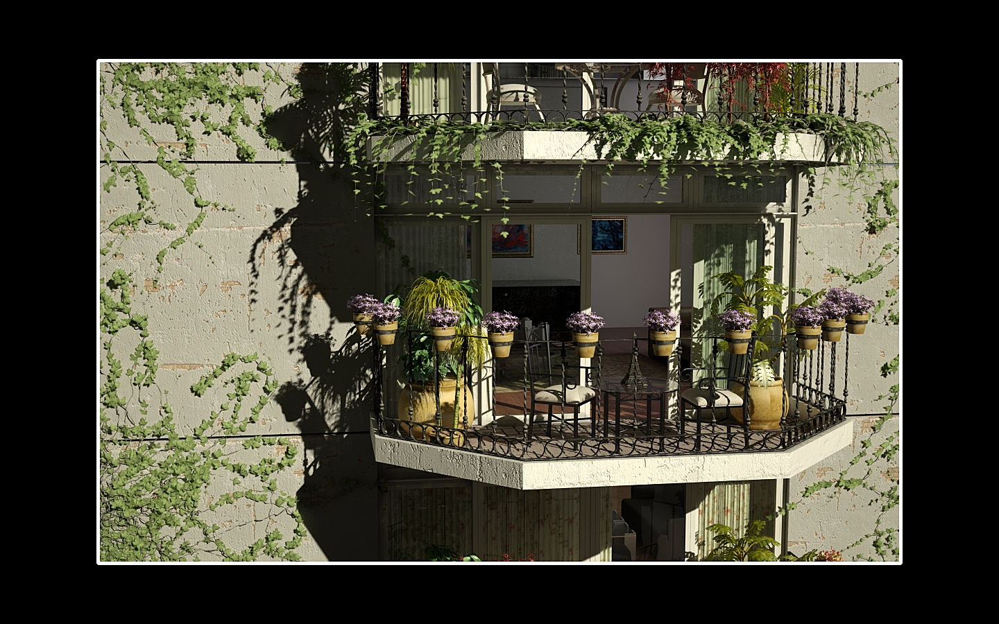Es curioso ver la imagen de un balcón desde ese punto de vista, te comento, creo que las enredaderas te han quedado muy bien, IV Generator? A mí no me cuadran las proporciones, pero esto del boom inmobiliario hizo que las alturas libres se redujeran en beneficio de poner más plantas al edificio, así que, por ahí igual tu piso es así, pero la altura de las sillas es la mitad de la altura de la puerta del balcón así que, un poco encorvado hay que andar por ahí, en cuanto a la iluminación, creo que la imagen esta apagada, quiero decir que el sol brilla de pleno sobre la fachada y la imagen esta baja de brillo y luminosidad, eso no me pega, creo que contribuye a esa sensación el color pastel de la fachada, creo que si las carpinterías fueran de un color más oscuro, te ganaría en contrastes.