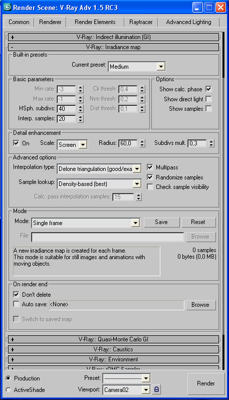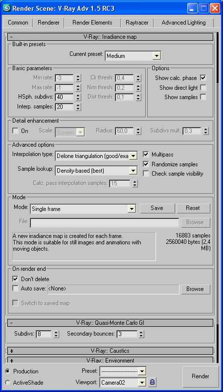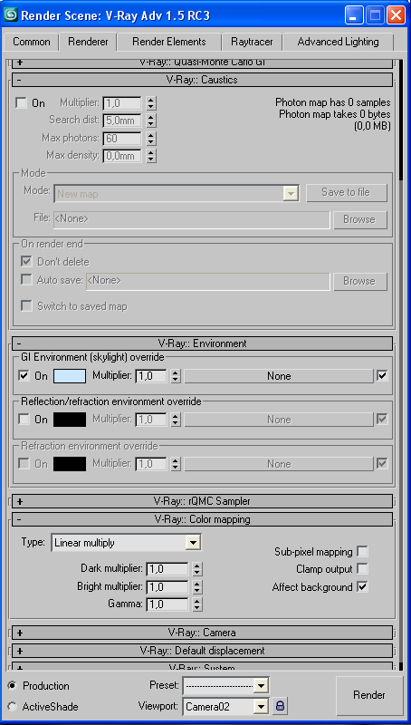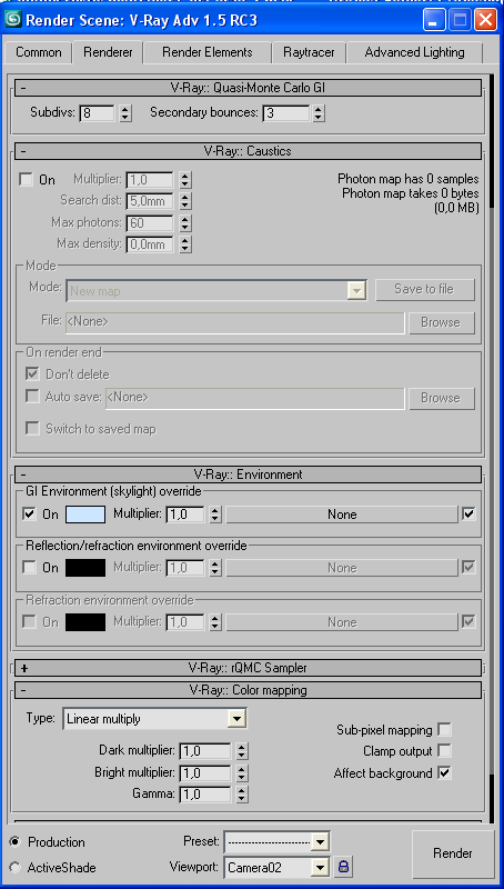 Soy un iniciado con 3ds Max 9 y un requeteiniciado con Vray 1.5 rc3. Eso si me lo leo todo y me veo todos los videos que corren por ahí. Pero hay un momento que ya no sé qué más hacer para arreglar ciertas cosas así que, ahí va, a ver si alguien me puerde echar un a mano. Os presento un interior renderizado con el motor de 3ds Max, y con materiales de 3ds Max, y el mismo archivo renderizado con Vray. Me salen muchos problemas a simple vista los veo, pero por más pruebas que hago y videotutoriales que leo, no puedo solucionarlos. Os adjunto también unas pantallas con las variables que he utilizado. Como veréis ahí diferencias entre los dos renders: