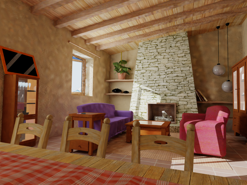 Los materiales con mucho glossiness como los globos blancos o el tiesto marrón o los jarritos negros de la estantería, han adquirido un aspecto más vidriado de lo normal.