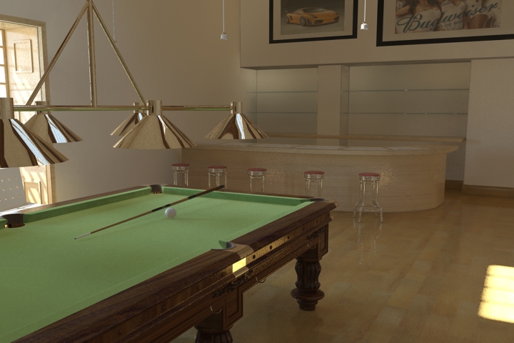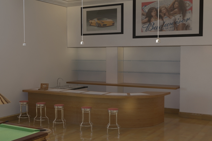 Y aquí pongo las 5 vistas, ya están casi completas, aún no tienen layers de rendre, pero ya está quedando casi, la idea es que la zona de bar esté un poco más oscura, también subí un poco las lampoaras de la mesa (aun faltan los focos) y ya falta poco. Saludos.