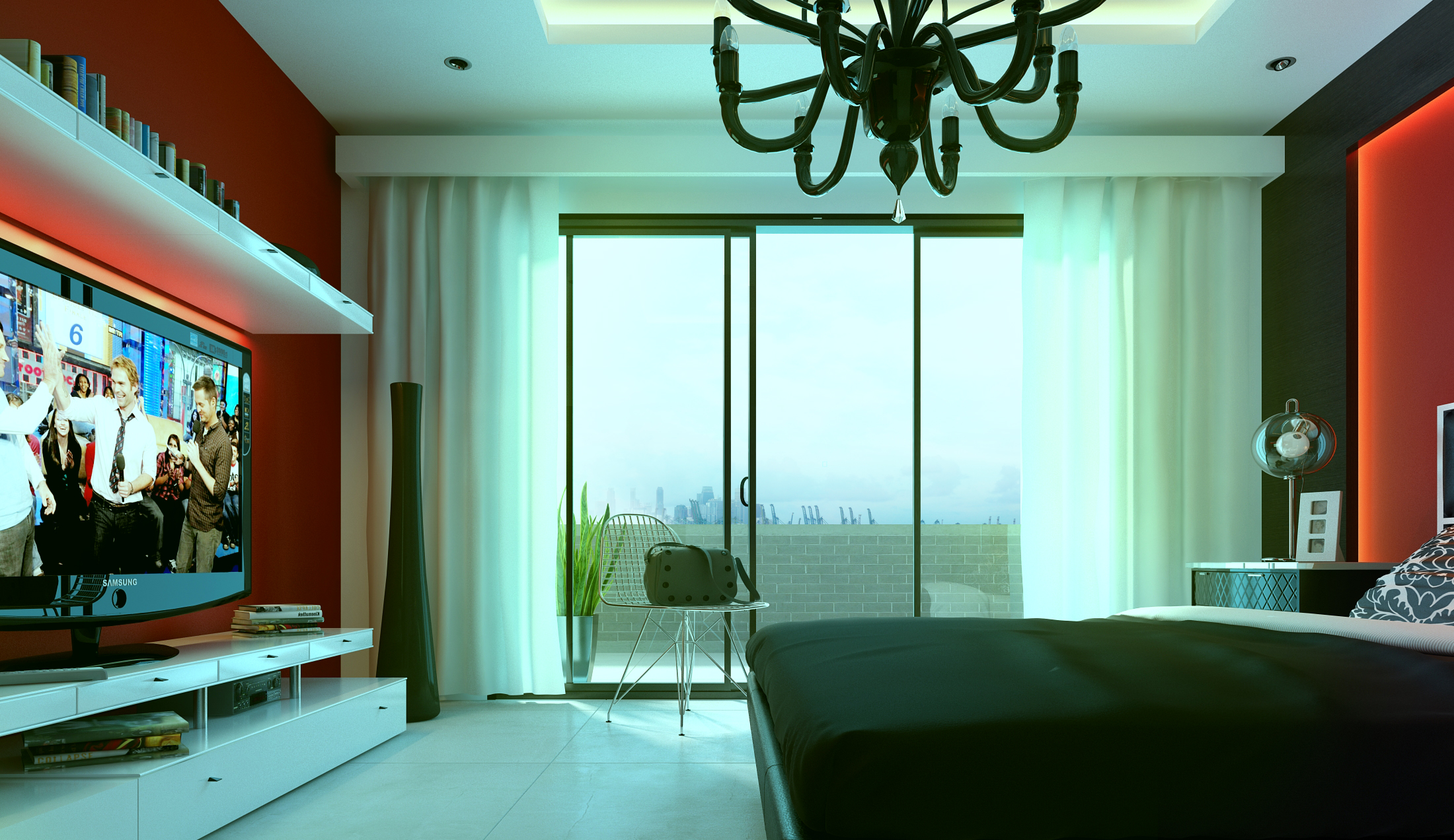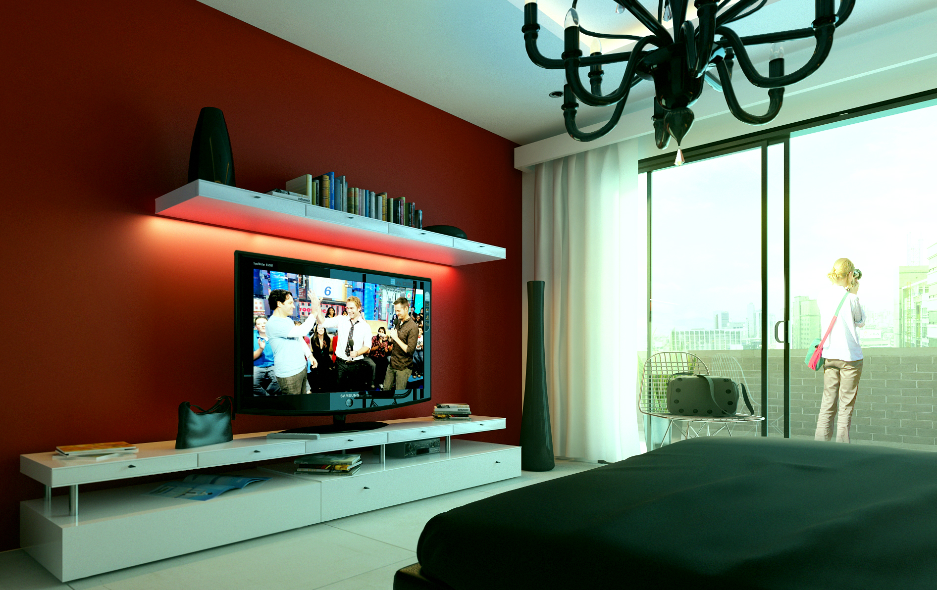 Muy buenas imágenes. Se ve que dominas bastante bien el tema de las texturas metálicas y demás. Lo único que me parece raro es la iluminación encima del televisor: la proyecta la parte de atrás de la televisión, o de dónde sale?