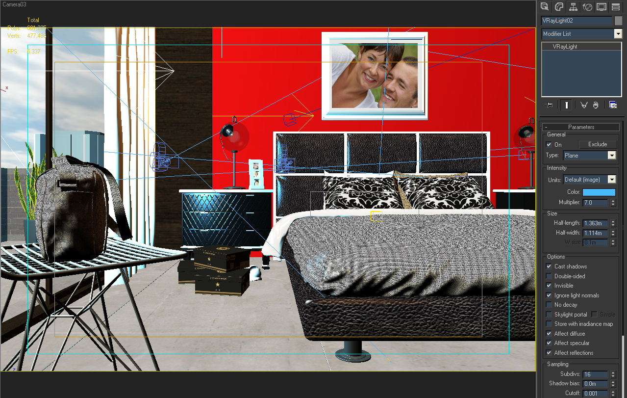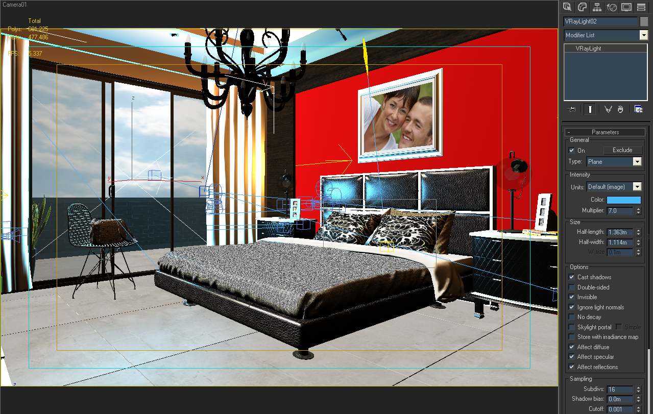 La iluminación es bastante simple, una Vray light en la manpara, de color celeste, y algunas Vray lights más para decoración, la luz del sol es una simple Target Direct.