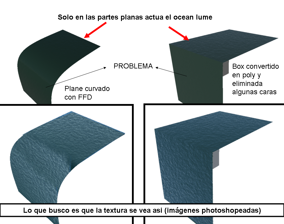 Estimados. Estoy haciendo un proyecto, donde necesito utilizar el material de Mental Ray ocean Lume. El tema es el siguiente, si el material lo inserto en un plane no tengo problemas, ya que se ve la textura de buena forma, pero cuando lo aplico a un volumen como, por ejemplo, un box, solo las caras horizantales se ve el agua, pero las otras no se ve bien.