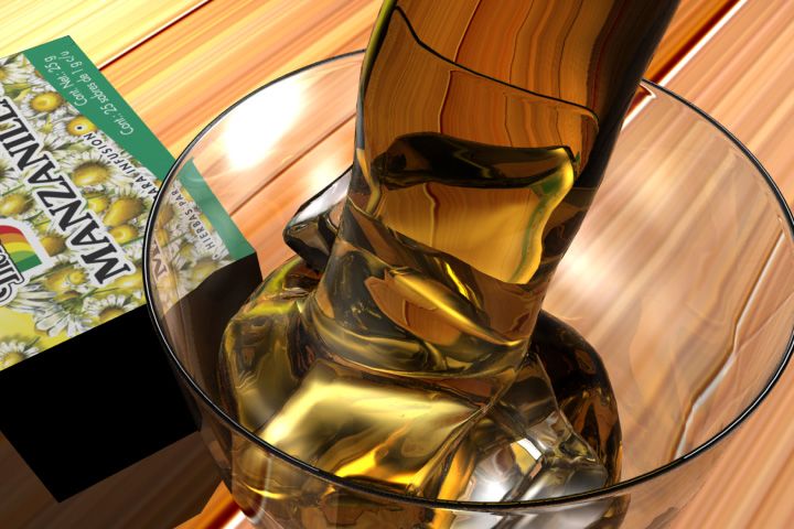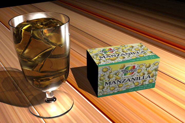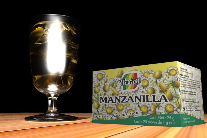 Como ya te dicen tiene muchas cosas que mejorar, la reflexión de la copa, las cáusticas de la copa, la fluidez del líquido, la textura de la madera, la caja de manzanilla (y esa tapa negra). Podríamos seguir, pero bueno, con el tiempo y paciencia creo que lo puedes mejorar mucho.