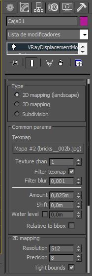La escena no puede ser más simple, una caja con mapa difuso ladrillo blanco y negro (en realidad sería un Bump de un ladrillado) y el vraydesplacementmod con los siguientes settings: