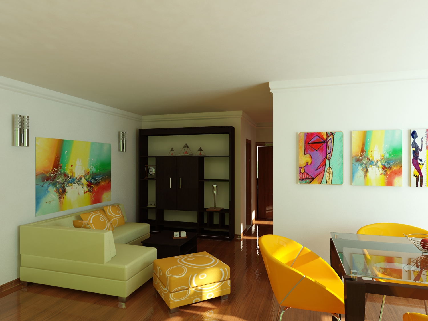 La imagen esta bien la iluminación sí que me gusta un poco oscuro en el mueble que hay a la izquierda, también corregiría la saturación de los colores que hay, por ejemplo, en el amarillo de los sillones, algo más de irregularidad en el sofá que lo veo demasiado cuadrado y lo del suelo que te han comentado antes porque parece que está empapado del exceso de brillo que tiene.
