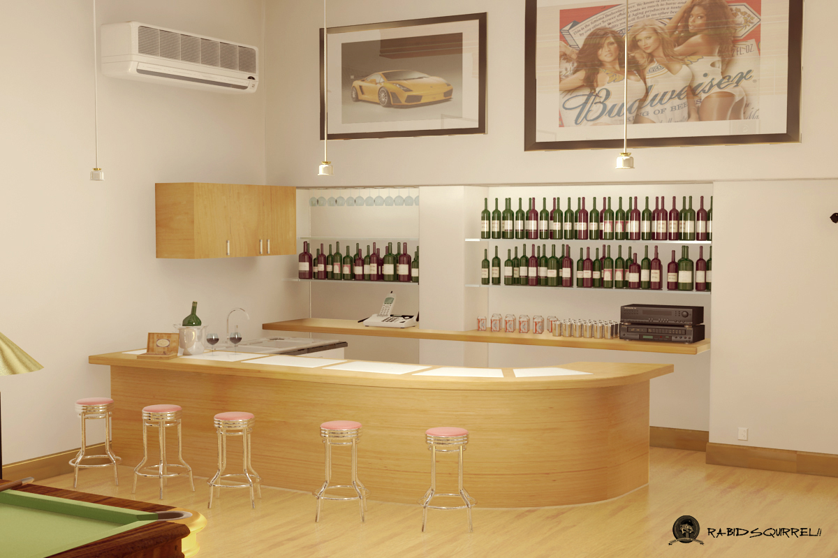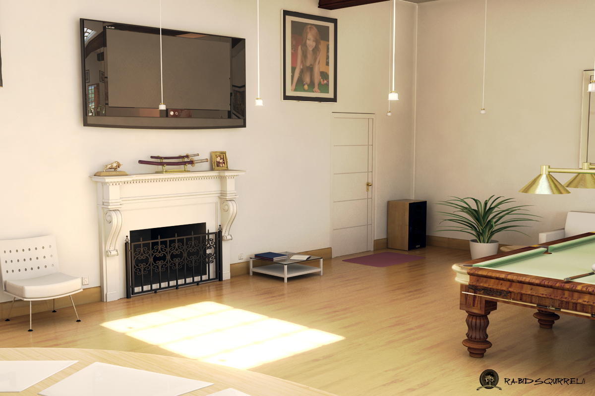 Al fin, después de unos inconvenientes por fin pude terminar el render de la sala de juegos, modelado en 3ds Max con Mental Ray, con layers de oclusión y luz, y reflejos Raw en algunas, exposición fotográfica asa 400, Daylight, GI activado y FG en medium. Unos cuantos retoques en Adobe Photoshop (sobre todo la luz volumétrica) y ya, un poco más de 3 horas x render, que fueron aproximadamente 17 horas en total, solo para descubrir que las botellas, cortinas, espadas y otras cosas estabab ocultas, así que, caballero, 17 horas más (pobre mi máquina) y ya está, quizás parezca un poco la proporción, pero puede ser al techo de casi 4pregunta de alto (es a propósito).