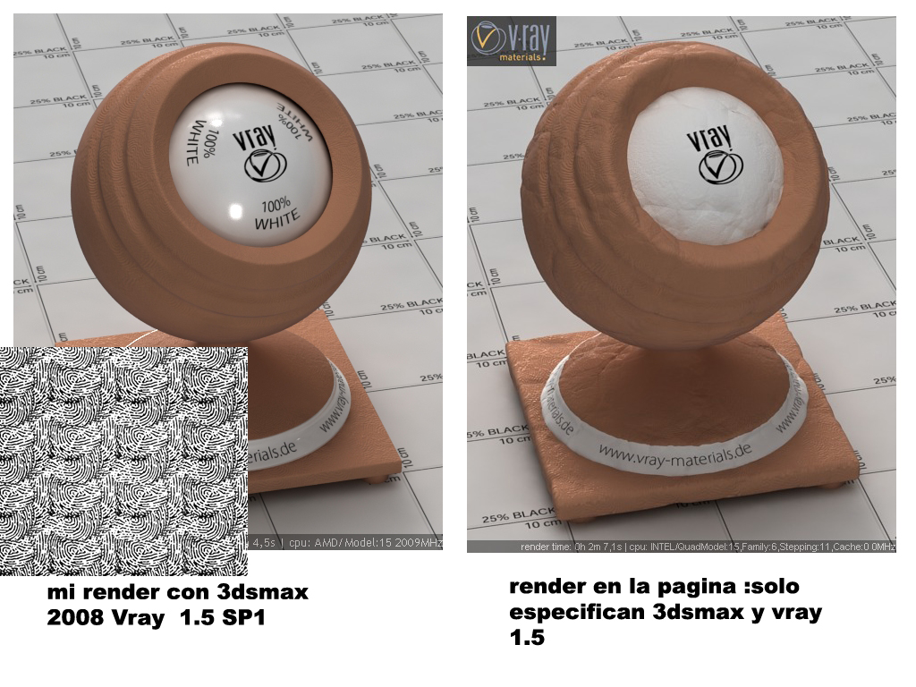 Controlo muy poco Vray, mi duda es porque mi render no tiene relieve como el de la web? Y de dónde viene ese relieve? De un mapa de bits que falta? Es un problema de versiones del Vray, es decir en otro Vray saldría como en la web? Muchas gracias.