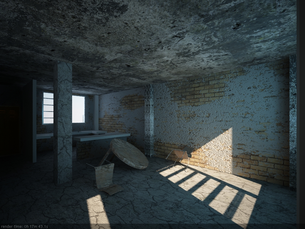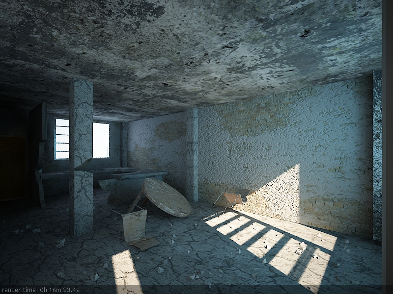 Hola a todos, estoy haciendo un ambiente muy sencillo el cual quisiera que se vea totalmente, destruido abandonado, sucio, dañado antiguo, todo eso, por ahora he puesto uno que otro materiales y sin mucho mobiliario, para que vayan comentando y asesorando con respecto a este tipo de render muchas gracias.