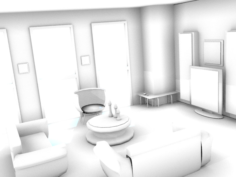 Después, le daría un poco más de Bump en paredes y en los sofá, mientras que en la mesa y en la butaca le quitaría un poco de mirror a las superficies reflectantes, fundamentalmente la butaca refleja de más a mi parecer. Por otro lado, la mesa no está muy poligonal? (no conozco que modelo quisiste hacer, esa fue la impresión que me dió en primera instancia).