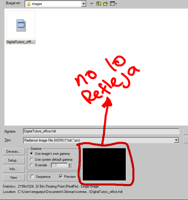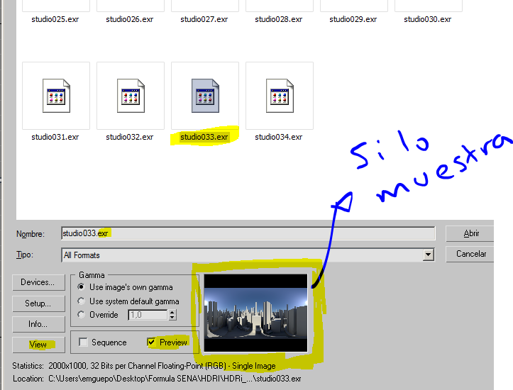 3. Como puedo ver la imagen del HDRI en mis archivos? Les cuento cuando abro la paleta de materiales y le doy al browse para buscar el HDRI que quiero aplicar, busco en mis carpetas donde los tengo alojados, pero no los puedo visualizar para así escogerlos, saben como poder visualizarlos? Ya que solo salen como iconos de la extensión.