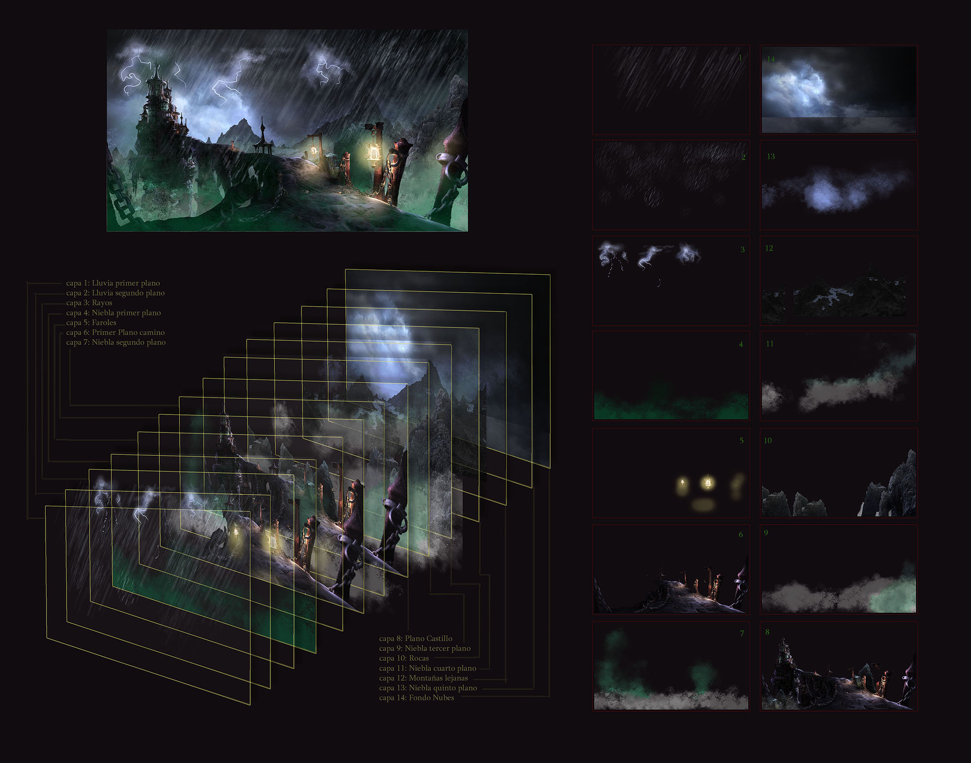 Pues se trata de un videojuego de corte Castlevania, así en 2.5d, o sea 2d con scroll y sprites prerenderizados, la página es www.darkmoncurse.com pero hasta después de la presentación de la demo no la vamos hacer, porque no hay tiempo. Esta ilustración en verdad ira separada en unas 14 capas para incluirle animación, que será el fondo del menú de juego.