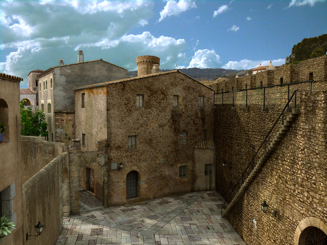 Lo más flojo, atrás hay una casa con arcos algo árabes, que se nota que es flat, que el relieve de los arcos y ventanas es un Bump de shader.