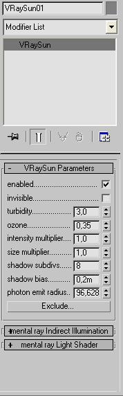 En su momento comencé probando con la intensidad de la Vray Sun, bajándolo del valor 1, pero luego leí en varios lados que lo mejor, y más parecido a la realidad, era dejarlo con el valor por defecto y tocar únicamente la cámara.