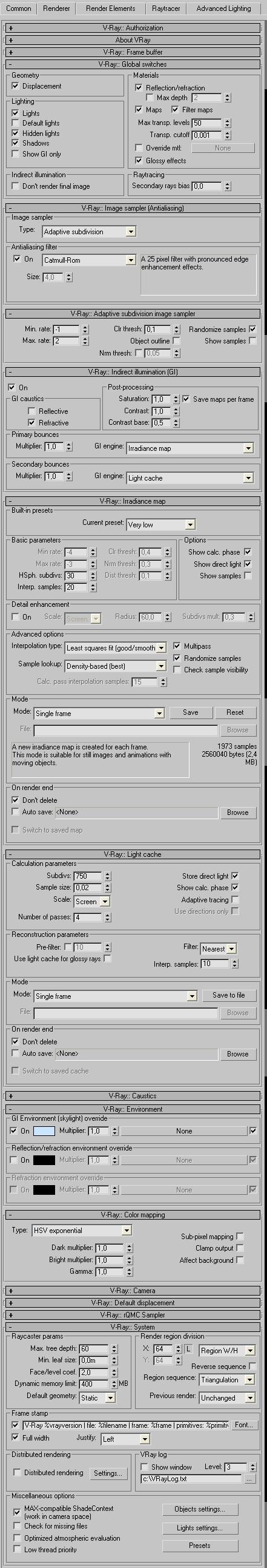 Qué tal, hace un tiempo ya (bastante) que utilizo 3d Studio junto a Vray, pero para exteriores siempre lo hice valiéndome de la clásica direct con la cámara estándar de 3ds Max. Hace un tiempo que estoy tratando de pasarme a Vray Sun + Vray Phisical camera y no logro dar con la tecla que hace que no se me quemen los renders, comenzando por el cielo (Vray Sky).