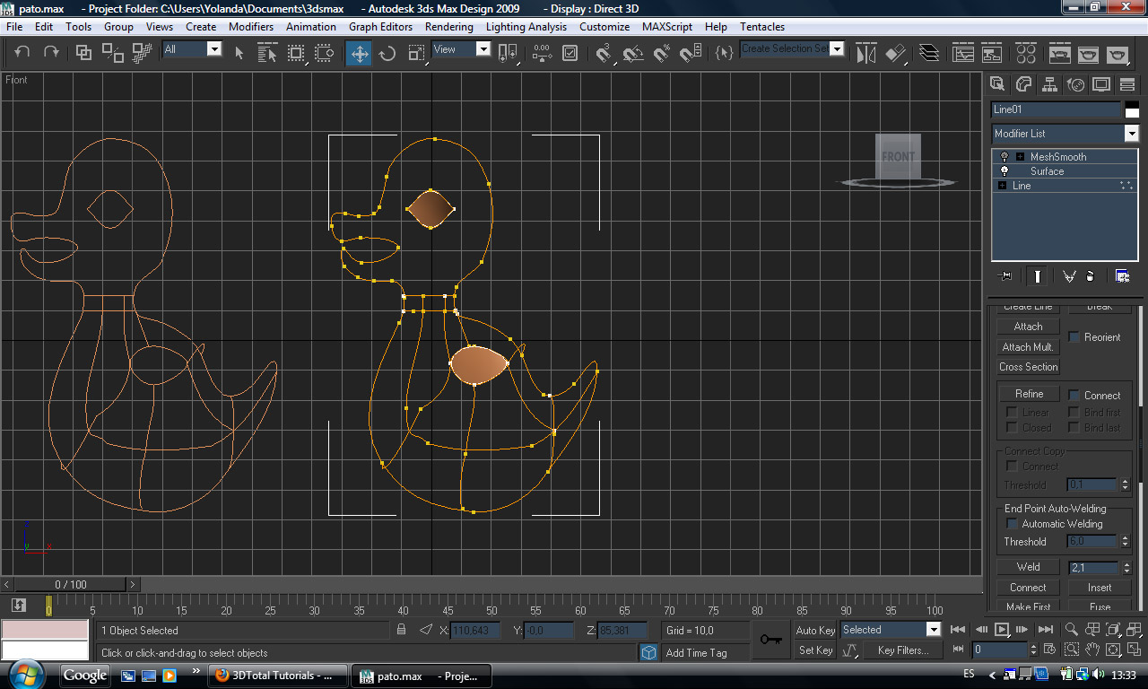 Y el problema (pues he desistido con Juana de Arco, demasiado nivel mejor empiezo de más abajo) es que, al aplicar el surface no me coge las Splines, todas son del mismo objeto, pero claro como no puedo soldar vértices debido a las restricciones del programa o al menos yo creo que es por eso, esto es lo que me queda. Estoy en lo que sería la página 2 del tutorial, y la verdad no entiendo que pasa y como resolverlo. Gracias de antemano.