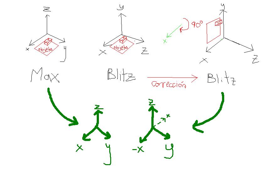 Tengo un cuerpo hecho en 3ds Max que inserto en el Blitz con formato.3ds, tengo 2 problemas: haciendo pruebas y pruebas (girando y moviendo la cámara) en Blitz logre darme cuenta que los ejes de coordenadas del Blitz y del 3ds Max no se correspondían. Resolví esto parcialmente girando el objeto unos 90 grados en las x, pero digo parcialmente, porque los ejes del 3dsmax y del Blitz no son superponibles: