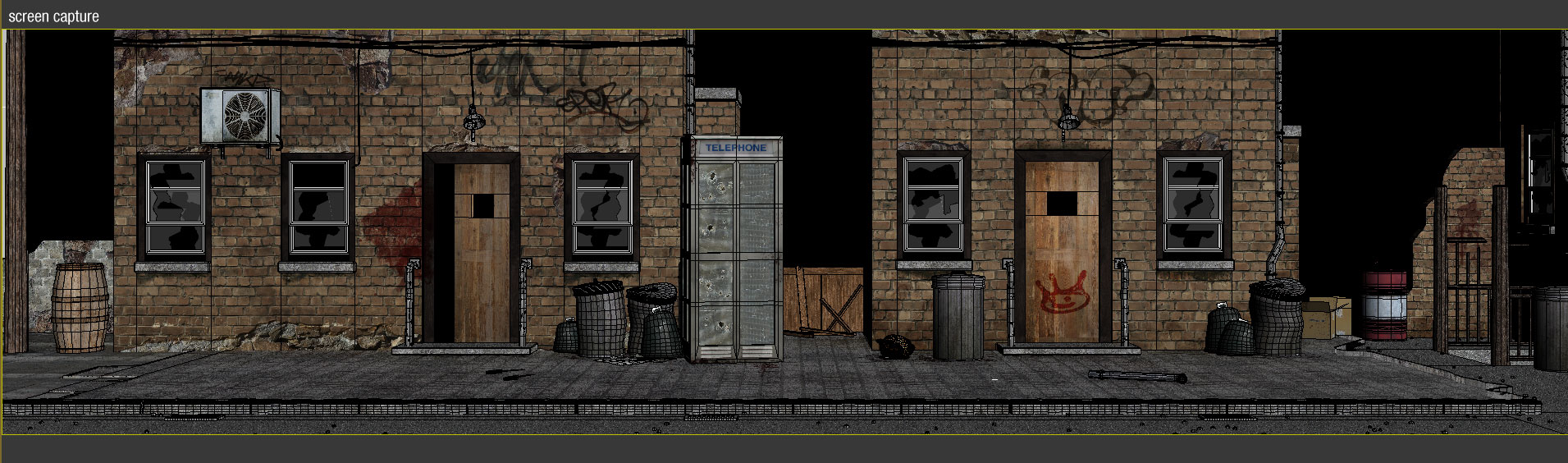 Estoy usando Unwrapping para casi todo, se puede apreciar en los edificios, acera y demás. Como siempre, trabajo con 3ds Max, Vray y Adobe Photoshop.